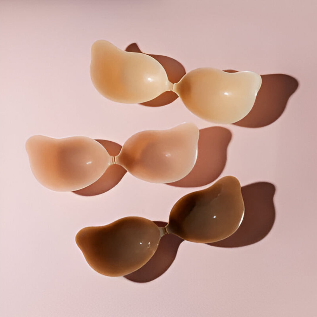 The silicone shaping cups, tapered “wings” & center clasp are what sculpt & bring everything together—the farther apart you apply the cups, the more dramatic cleavage when clasped.
